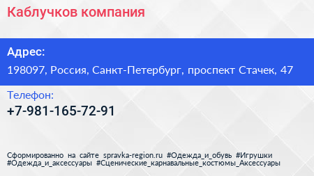 Каблучков, компания по адресу 198097, Россия, Санкт-Петербург, проспект Стачек, 47 в дальнейшем Организация, размещена в следующих категориях: