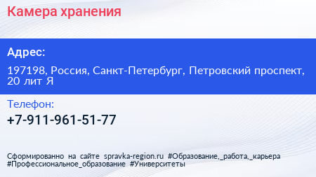 Камера хранения по адресу 197198, Россия, Санкт-Петербург, Петровский проспект, 20 лит Я в дальнейшем Организация, размещена в следующих категориях: