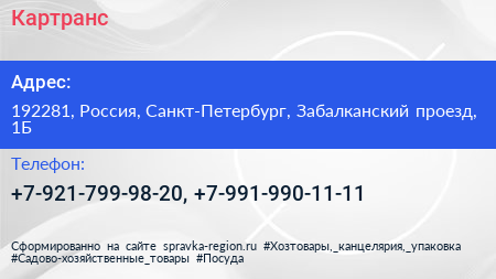 Картранс по адресу 192281, Россия, Санкт-Петербург, Забалканский проезд, 1Б в дальнейшем Организация, размещена в следующих категориях: