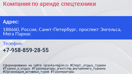 Компания по аренде спецтехники по адресу 188660, Россия, Санкт-Петербург, проспект Энгельса, Мега Парнас в дальнейшем Организация, размещена в следующих категориях: