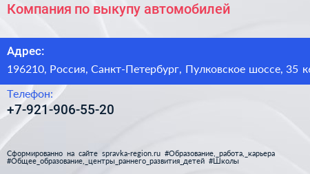 Компания по выкупу автомобилей по адресу 196210, Россия, Санкт-Петербург, Пулковское шоссе, 35 к6 в дальнейшем Организация, размещена в следующих категориях: