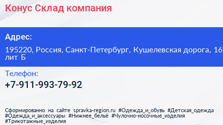 Конус Склад, компания по адресу 195220, Россия, Санкт-Петербург, Кушелевская дорога, 16 лит Б в дальнейшем Организация, размещена в следующих категориях:
