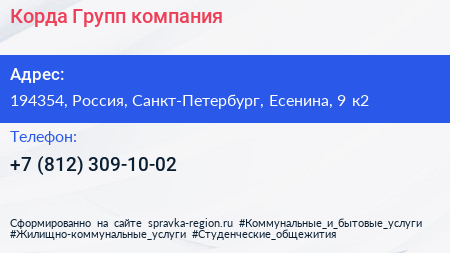 Корда Групп, компания по адресу 194354, Россия, Санкт-Петербург, Есенина, 9 к2 в дальнейшем Организация, размещена в следующих категориях: