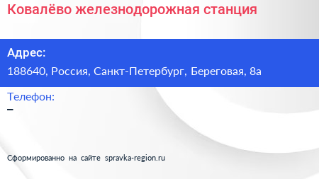 Ковалёво, железнодорожная станция по адресу 188640, Россия, Санкт-Петербург, Береговая, 8а в дальнейшем Организация, размещена в следующих категориях:
