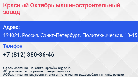 Красный Октябрь, машиностроительный завод по адресу 194021, Россия, Санкт-Петербург, Политехническая, 13-15 в дальнейшем Организация, размещена в следующих категориях:
