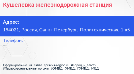 Кушелевка, железнодорожная станция по адресу 194021, Россия, Санкт-Петербург, Политехническая, 1 к5 в дальнейшем Организация, размещена в следующих категориях: