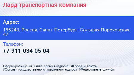 Лард, транспортная компания по адресу 195248, Россия, Санкт-Петербург, Большая Пороховская, 47 в дальнейшем Организация, размещена в следующих категориях: