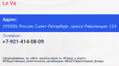 Le-Va по адресу 195030, Россия, Санкт-Петербург, шоссе Революции, 114 в дальнейшем Организация, размещена в следующих категориях: