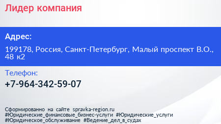 Лидер, компания по адресу 199178, Россия, Санкт-Петербург, Малый проспект В.О., 48 к2 в дальнейшем Организация, размещена в следующих категориях: