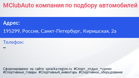 MClubAuto, компания по подбору автомобилей по адресу 195299, Россия, Санкт-Петербург, Киришская, 2а в дальнейшем Организация, размещена в следующих категориях: