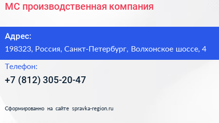 МС, производственная компания по адресу 198323, Россия, Санкт-Петербург, Волхонское шоссе, 4 в дальнейшем Организация, размещена в следующих категориях: