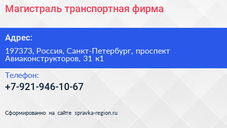 Магистраль, транспортная фирма по адресу 197373, Россия, Санкт-Петербург, проспект Авиаконструкторов, 31 к1 в дальнейшем Организация, размещена в следующих категориях: