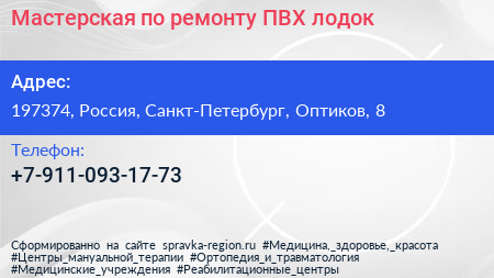 Мастерская по ремонту ПВХ лодок по адресу 197374, Россия, Санкт-Петербург, Оптиков, 8 в дальнейшем Организация, размещена в следующих категориях: