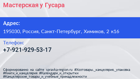 Мастерская у Гусара по адресу 195030, Россия, Санкт-Петербург, Химиков, 2 к16 в дальнейшем Организация, размещена в следующих категориях: