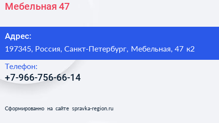 Мебельная-47 по адресу 197345, Россия, Санкт-Петербург, Мебельная, 47 к2 в дальнейшем Организация, размещена в следующих категориях: