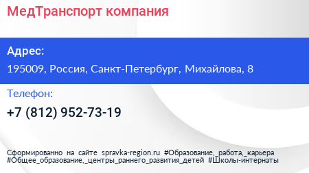 МедТранспорт, компания по адресу 195009, Россия, Санкт-Петербург, Михайлова, 8 в дальнейшем Организация, размещена в следующих категориях: