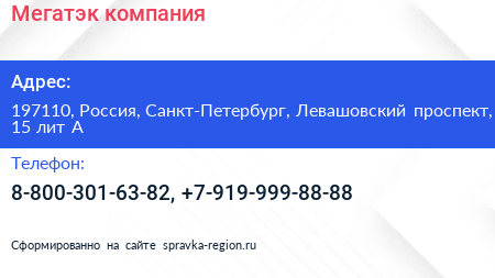 Мегатэк, компания по адресу 197110, Россия, Санкт-Петербург, Левашовский проспект, 15 лит А в дальнейшем Организация, размещена в следующих категориях: