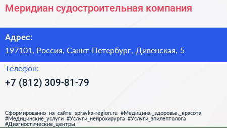 Меридиан, судостроительная компания по адресу 197101, Россия, Санкт-Петербург, Дивенская, 5 в дальнейшем Организация, размещена в следующих категориях: