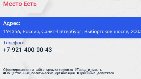 Место Есть по адресу 194356, Россия, Санкт-Петербург, Выборгское шоссе, 200а в дальнейшем Организация, размещена в следующих категориях: