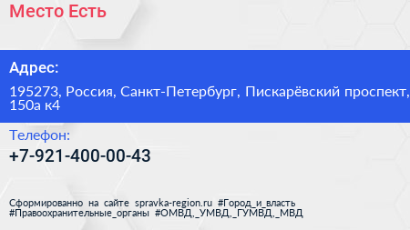 Место Есть по адресу 195273, Россия, Санкт-Петербург, Пискарёвский проспект, 150а к4 в дальнейшем Организация, размещена в следующих категориях:
