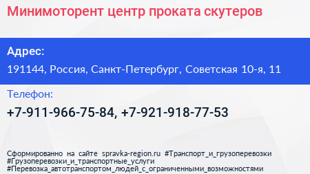 Минимоторент, центр проката скутеров по адресу 191144, Россия, Санкт-Петербург, Советская 10-я, 11 в дальнейшем Организация, размещена в следующих категориях: