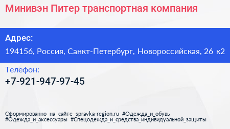 Минивэн-Питер, транспортная компания по адресу 194156, Россия, Санкт-Петербург, Новороссийская, 26 к2 в дальнейшем Организация, размещена в следующих категориях: