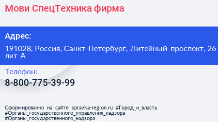 Мови-СпецТехника, фирма по адресу 191028, Россия, Санкт-Петербург, Литейный проспект, 26 лит А в дальнейшем Организация, размещена в следующих категориях: