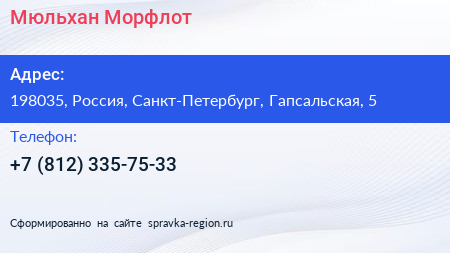 Мюльхан Морфлот по адресу 198035, Россия, Санкт-Петербург, Гапсальская, 5 в дальнейшем Организация, размещена в следующих категориях: