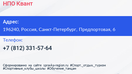 НПО Квант по адресу 196240, Россия, Санкт-Петербург, Предпортовая, 6 в дальнейшем Организация, размещена в следующих категориях: