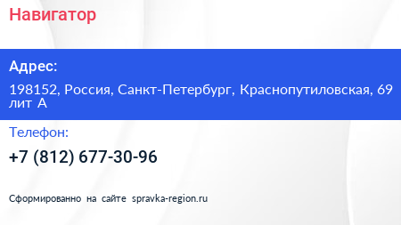 Навигатор по адресу 198152, Россия, Санкт-Петербург, Краснопутиловская, 69 лит А в дальнейшем Организация, размещена в следующих категориях: