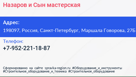 Назаров и Сын, мастерская по адресу 198097, Россия, Санкт-Петербург, Маршала Говорова, 27Б в дальнейшем Организация, размещена в следующих категориях: