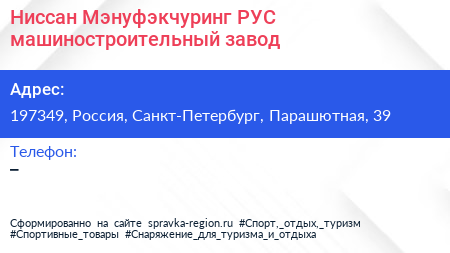 Ниссан Мэнуфэкчуринг РУС, машиностроительный завод по адресу 197349, Россия, Санкт-Петербург, Парашютная, 39 в дальнейшем Организация, размещена в следующих категориях: