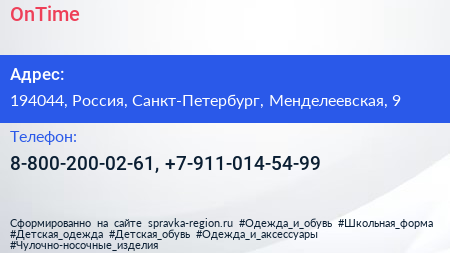 OnTime по адресу 194044, Россия, Санкт-Петербург, Менделеевская, 9 в дальнейшем Организация, размещена в следующих категориях: