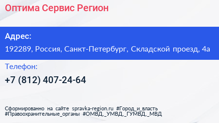 Оптима Сервис Регион по адресу 192289, Россия, Санкт-Петербург, Складской проезд, 4а в дальнейшем Организация, размещена в следующих категориях: