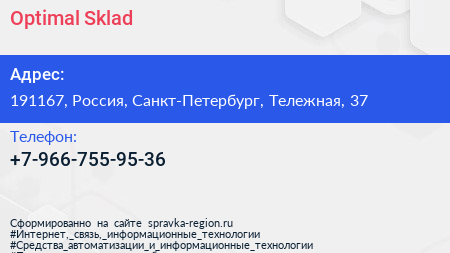 Optimal Sklad по адресу 191167, Россия, Санкт-Петербург, Тележная, 37 в дальнейшем Организация, размещена в следующих категориях:
