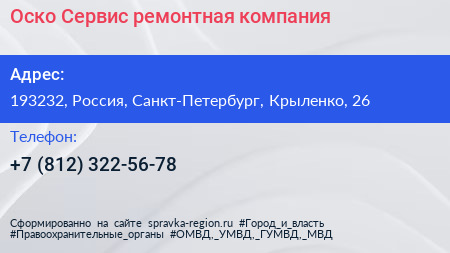 Оско-Сервис, ремонтная компания по адресу 193232, Россия, Санкт-Петербург, Крыленко, 26 в дальнейшем Организация, размещена в следующих категориях: