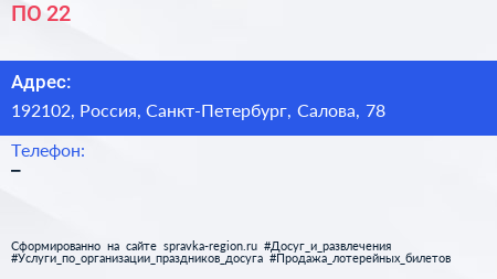 ПО-22 по адресу 192102, Россия, Санкт-Петербург, Салова, 78 в дальнейшем Организация, размещена в следующих категориях: