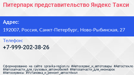 Питерпарк, представительство Яндекс.Такси по адресу 192007, Россия, Санкт-Петербург, Ново-Рыбинская, 27 в дальнейшем Организация, размещена в следующих категориях: