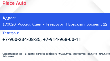 Place Auto по адресу 190020, Россия, Санкт-Петербург, Нарвский проспект, 22 в дальнейшем Организация, размещена в следующих категориях: