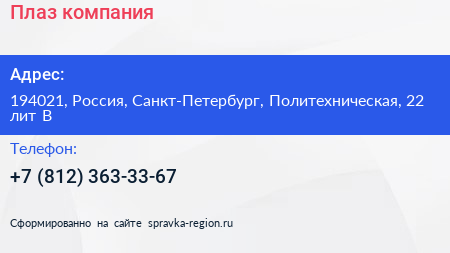 Плаз, компания по адресу 194021, Россия, Санкт-Петербург, Политехническая, 22 лит В в дальнейшем Организация, размещена в следующих категориях: