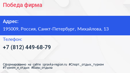 Победа, фирма по адресу 195009, Россия, Санкт-Петербург, Михайлова, 13 в дальнейшем Организация, размещена в следующих категориях: