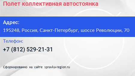 Полет, коллективная автостоянка по адресу 195248, Россия, Санкт-Петербург, шоссе Революции, 70 в дальнейшем Организация, размещена в следующих категориях: