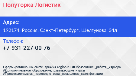 Полуторка Логистик по адресу 192174, Россия, Санкт-Петербург, Шелгунова, 34л в дальнейшем Организация, размещена в следующих категориях: