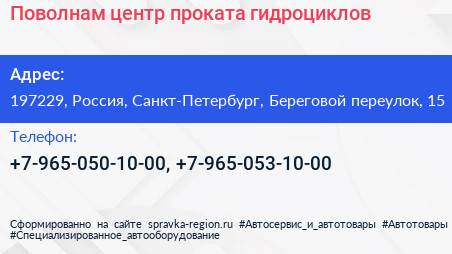 Поволнам, центр проката гидроциклов по адресу 197229, Россия, Санкт-Петербург, Береговой переулок, 15 в дальнейшем Организация, размещена в следующих категориях: