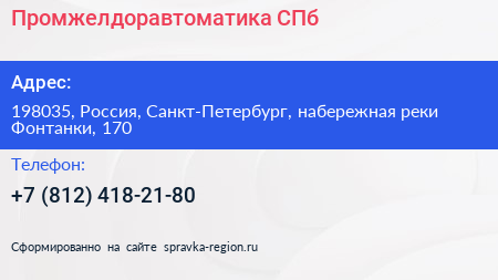 Промжелдоравтоматика СПб по адресу 198035, Россия, Санкт-Петербург, набережная реки Фонтанки, 170 в дальнейшем Организация, размещена в следующих категориях:
