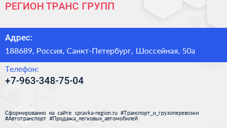 РЕГИОН ТРАНС-ГРУПП по адресу 188689, Россия, Санкт-Петербург, Шоссейная, 50а в дальнейшем Организация, размещена в следующих категориях: