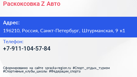 Раскоксовка Z Авто по адресу 196210, Россия, Санкт-Петербург, Штурманская, 9 к1 в дальнейшем Организация, размещена в следующих категориях: