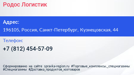 Родос Логистик по адресу 196105, Россия, Санкт-Петербург, Кузнецовская, 44 в дальнейшем Организация, размещена в следующих категориях: