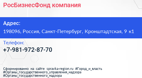 РосБизнесФонд, компания по адресу 198096, Россия, Санкт-Петербург, Кронштадтская, 9 к1 в дальнейшем Организация, размещена в следующих категориях: