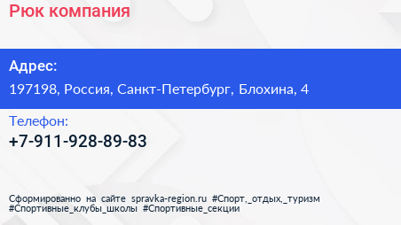 Рюк, компания по адресу 197198, Россия, Санкт-Петербург, Блохина, 4 в дальнейшем Организация, размещена в следующих категориях: